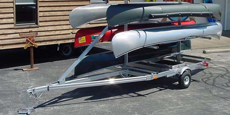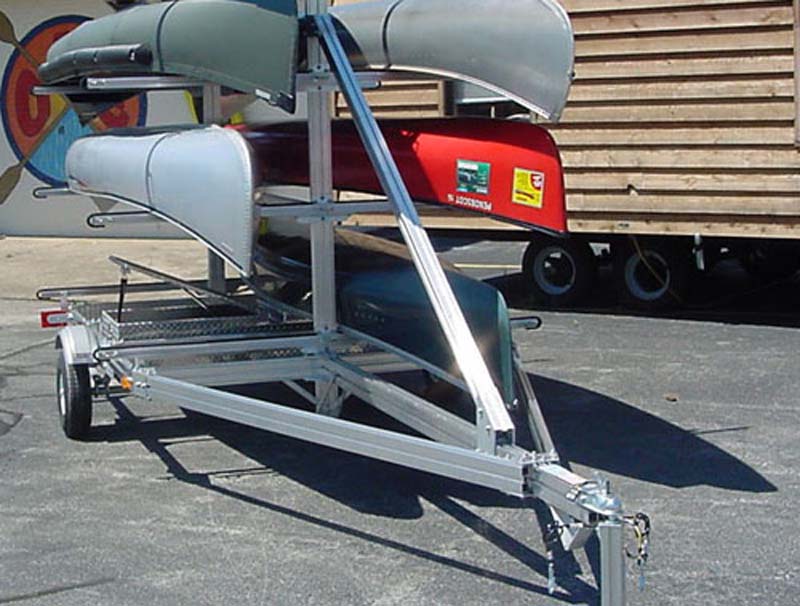 All bolted aluminum trailer with 1000 lb capacity, fully adjustable for 6 canoes up to 18ft. Includes standard adjustable crossbars with vinyl extrusions, 12″ galvanized wheels, and aluminum fenders.